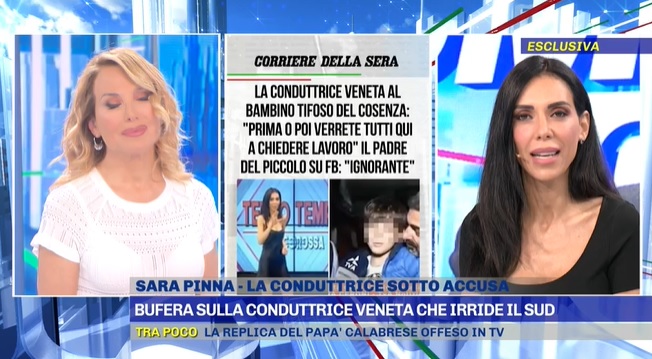 “Il giorno seguente alla frase sono andata direttamente dai tifosi cosentini, sono entrati nei loro gruppi e ho chiesto scusa. Mi sono scusata anche con il padre del bambino, Michele, e lui ha accettato le mie scuse”, spiega la conduttrice a Barbara d’Urso.