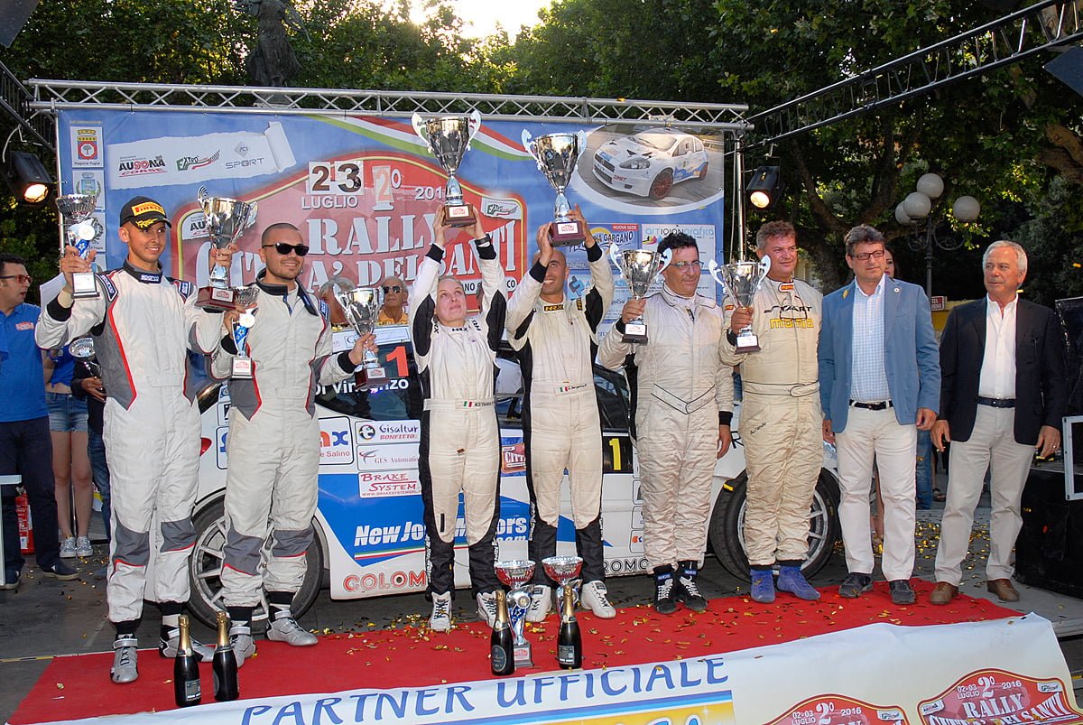 Pronostici rispettati per la seconda edizione del Rally Città dei Santi: questa volta Bergantino, navigato da Michela Di Vincenzo, non ha avuto avversari in grado di impensierirlo, e ha dominato la gara sin dalle prime battute, mantenendo il comando fino al termine, grazie anche all’affidabilità e la prestazioni della sua Peugeot 207 S2000. Posizioni stabili durante la gara per gli inseguitori: Domenico Erbetta e Valerio Silvaggi, anch’essi su Peugeot 207, che hanno terminato secondi, Piero Azzarone e Domenico Ortuso, su Mitsubishi Lancer, sul terzo gradino del podio. Bergantino ha subito attaccato incrementando il distacco dagli inseguitori nel corso delle prime prove speciali, per poi regolare agevolmente il suo vantaggio nelle ultime fasi della gara. Ottimo quarto assoluto l’equipaggio composto da Maurizio De Salvia e Michele De Cristofaro, su Renault Clio S1600, mai impensieriti dagli inseguitori nonostante la penalità di 10” attribuitagli per una partenza anticipata. Un po’ di battaglia si è registrata per il 5° posto, dove lo scatenato, giovanissimo siciliano Salvatore Campione, in coppia con Alfonso Chiappara, sulla piccola Peugeot 106 K10 è riuscito a scalzare i salentini Memmi – Iacobelli, su una ben più potente Peugeot 207 S2000. La classe più numerosa e combattuta è stata certamente la N3, dove i locali fratelli Stilla, che avevano debuttato su queste strade un anno fa sempre su una Renault Clio RS2000, sono giunti secondi dietro il più esperto equipaggio molisano composto da Caposiena e Pariselli, su medesima vettura, dopo una bella sfida che ha visto protagonisti anche i salentini Salvatore e Giorgia Ascalone, poi coinvolti in una uscita di strada. Gara difficile per Vincenzo Troiano e Massimo Sansone, su una Lancia Delta Integrale afflitta da diversi problemi tecnici legati anche agli anni, seppure gloriosi, sulle spalle di questa vettura; ciò nonostante sono riusciti a terminare settimi assoluti. Difficoltà tecniche anche per i salentini Maurizio Di Gesù e Cristian Quarta, che pertanto non sono riusciti ad esprimere al meglio il loro potenziale e quello della vettura, una Mitsubishi Lancer Evo IX, terminando la gara al tredicesimo posto. Da segnalare l’esordio del pilota locale Antonio Bonfitto, navigato dall’esperto Rosario Navarra: con regolarità e grande soddisfazione hanno condotto al termine la gara, al 21° posto. Uscita di strada sulla sesta prova speciale “San Salvatore”, su una curva molto sporca a seguito dei passaggi precedenti, della Renault Clio RS di Salvatore e Giorgia Ascalone. Gara finita fuori strada anche per la Fiat 600 di Davide Masi e Simone Maliziola, sulla settima prova speciale “Borgo Celano”; in entrambi i casi senza conseguenze per gli occupanti. Sono questi gli unici ritiri dalla gara, che ha quindi visto 28 vetture transitare sul palco di arrivo a San Giovanni Rotondo per la cerimonia di premiazione. Grande e gioiosa la festa del podio, alla presenza del campione Sandro Munari, dell’attore Marco Milano e dei sindaci di San Giovanni Rotondo, San Marco in Lamis e Rignano Garganico, che hanno consegnato i trofei ai primi classificati. Il Trofeo Gino De Salvia, cui era intitolata la gara, in ricordo del compianto pilota sipontino, è stato consegnato ai vincitori dal figlio Maurizio, classificatosi quarto assoluto.