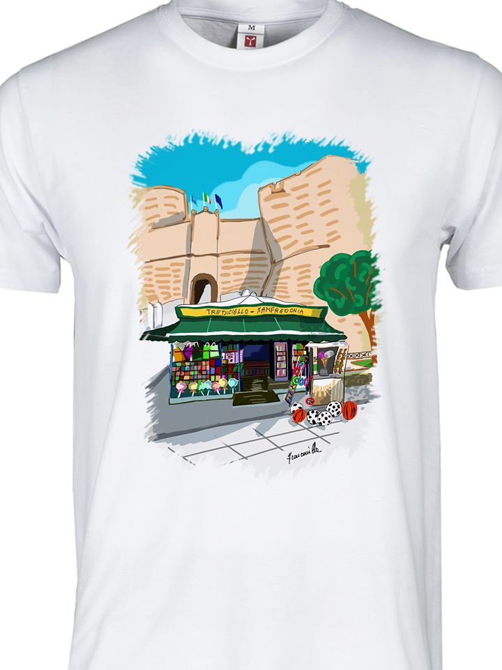 L’artista sipontino ha anche creato illustrazioni del Gargano nello specifico in queste maglie vediamo l’arco di san Felice ed il Pizzomunno entrambi a vieste.