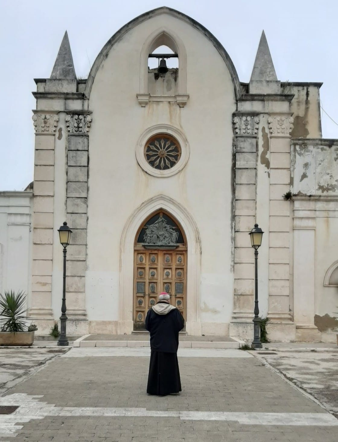 UN PADRE PER TUTTI I FIGLI.UNA PREGHIERA DAVANTI ALLE PORTE CHIUSE DELLA CAPPELLA CIMITERIALE PER CHIEDERE CHE SI SPALANCHINO QUELLE DEL CIELO PER I TANTI NOSTRI CARI DEFUNTI.LA VOCE ROTTA DALLA COMMOZIONE.I GUANTI E LA MASCHERINA COME INSEGNE PASTORALI DI UN VESCOVO CHE PIANGE E SPERA ASSIEME AL SUO POPOLO.