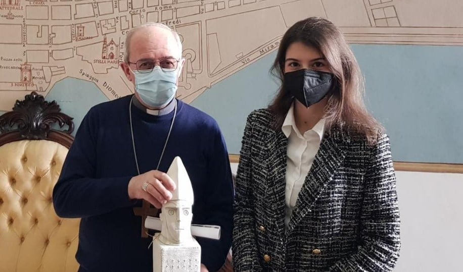 La Presidente ha, poi, raccontato, ad un Monsignor Moscone apparso molto interessato, particolari relativi alla carica politica da lei ricoperta, soffermandosi sulla grande importanza che questa assume per assicurare il regolare svolgimento dei lavori del Consiglio Comunale e per consentire a tutti i Consiglieri di esercitare con pienezza le proprie funzioni. Al termine della visita, non è mancato il rituale scambio di doni: Monsignor Moscone ha regalato alla giovane Presidente Titta un suo libro (seconda Lettera pastorale), mentre la Presidente ha omaggiato il Vescovo con un’opera in ceramica, realizzata dall’artista manfredoniana Angela Quitadamo, riproducente una testa delle Stele Daunie.