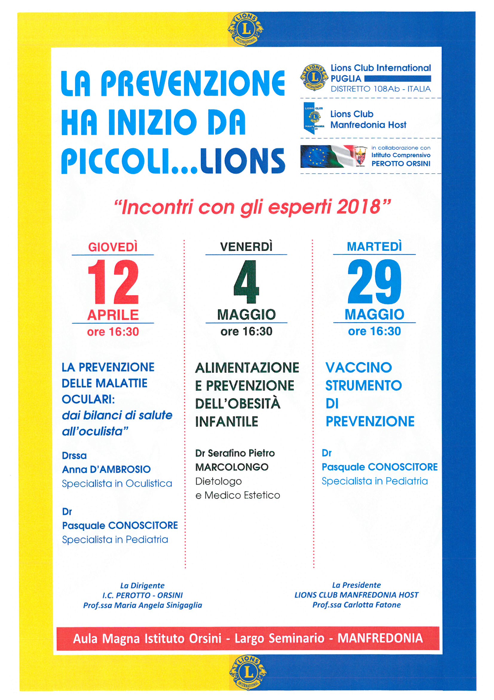 Prende il via oggi, giovedì 12 aprile, una serie di sei incontri, organizzati dal Lions Club Manfredonia Host in collaborazione con l’I.C. Perotto Orsini, che ha come comune denominatore la prevenzione che comincia da piccoli per dare vita a degli autentici “leoncini”, come forza e vigore.