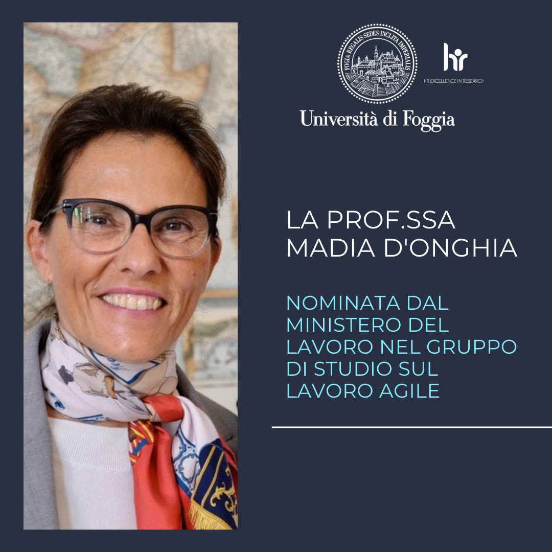 La professoressa Madia D’Onghia, docente di Diritto del Lavoro presso il Dipartimento di Giurisprudenza dell’Università di Foggia e presidente del Comitato Unico di Garanzia per le Pari Opportunità (CUG), è stata nominata all’interno del gruppo di studio sul lavoro agile appena costituito dal Ministro del Lavoro e delle Politiche Sociali Andrea Orlando.