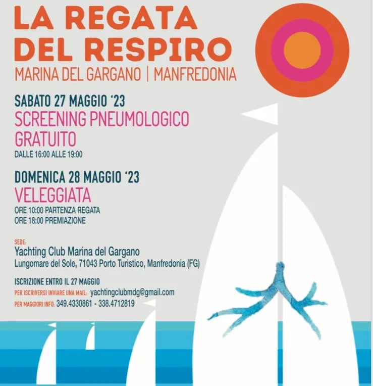 Sabato 27 Maggio a partire dalle ore 16.00 i medici del Reparto di Malattie dell’Apparato Respiratorio Universitario del Policlinico di Foggia, diretto dal Prof. Donato Lacedonia, con la collaborazione del Dott. Gianluca Ciliberti e dei medici in formazione eseguiranno, dinanzi la sede dello Yachting Club Marina del Gargano presso il Porto Turistico di Manfredonia, valutazioni cliniche alle quali potranno sottoporsi gratuitamente e senza prenotazionetutti i cittadini.