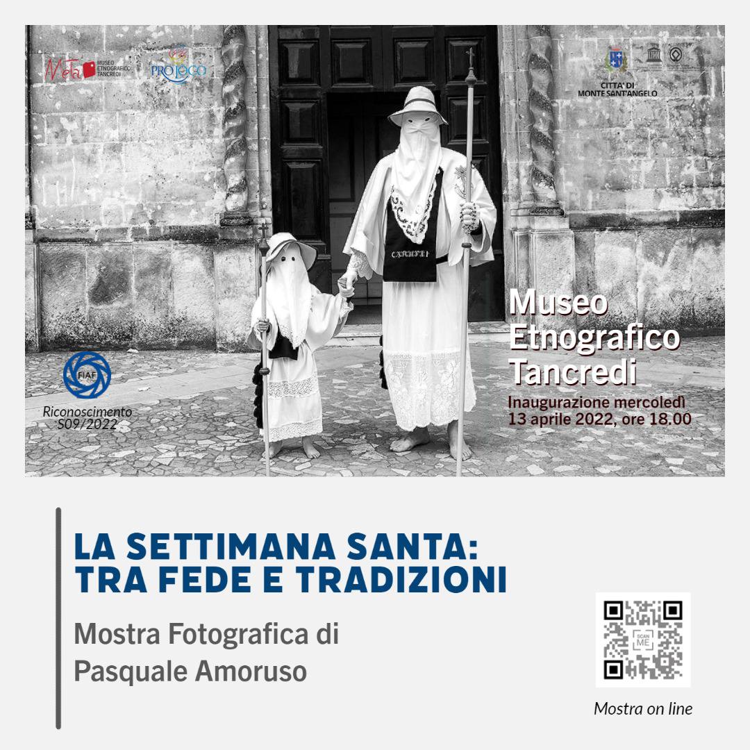 Mercoledì 13 Aprile, alle ore 18.00, presso il Meta – Museo Etnografico Tancredi, si svolgerà l’inaugurazione della mostra fotografica “La Settimana Santa: tra fede e tradizioni” del fotografo Pasquale Amoruso, a cura della Pro Loco di Monte Sant’Angelo.