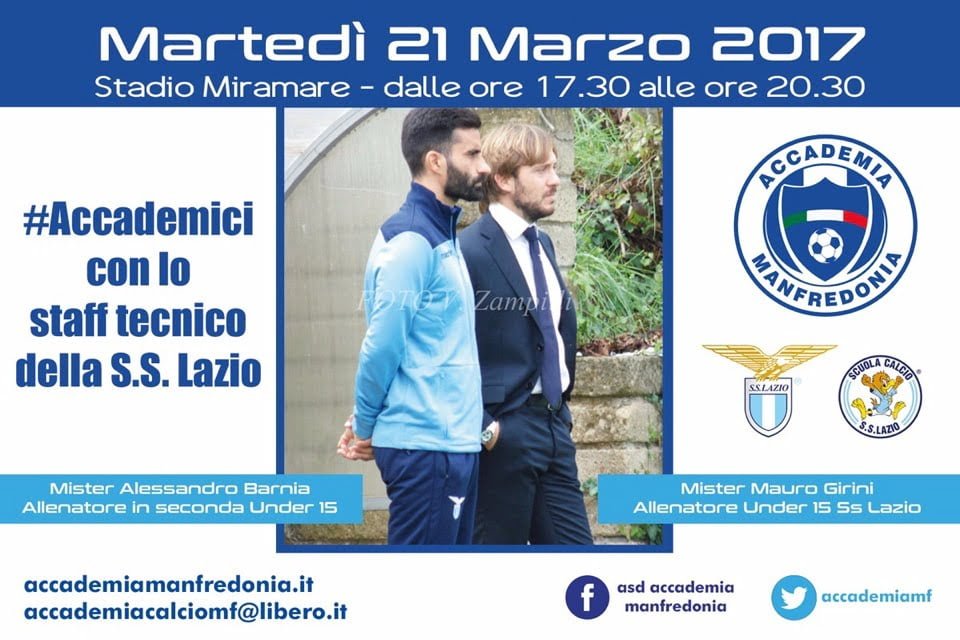 Un appuntamento di grande rilievo sportivo e tecnico è in programma martedì 21marzo. Ritorna a Manfredonia la Lazio, ovvero fanno visita al Miramare tecnici del settore giovanile della più antica squadra di calcio di Roma. Ospiti dell’A.S.D. Accademia Manfredonia, sin dalle ore 17,30 presso lo Stadio Miramare, due figure di grande rilievo, quali Mister Mauro Girini, allenatore Under 15 ed il suo secondo Mister Alessandro Barnia .