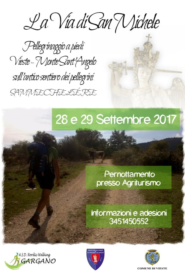 Da quest’anno la strada del Pellegrinaggio al Santuario di San Michele si allarga anche ad una nuova collaborazione con l’associazione sportiva Nordic Walking Gargano, che parteciperà a questo grande cammino di fede partendo da Vieste già dal mattino del 28 settembre e inserendo una sosta in un agriturismo a metà percorso. Il giorno seguente seguirà la fusione con i pellegrini “Sammechelere” che saranno partiti da Vieste nella notte, quasi un abbraccio fraterno, per affrontare tutti insieme gli ultimi km verso la Basilica Celeste.