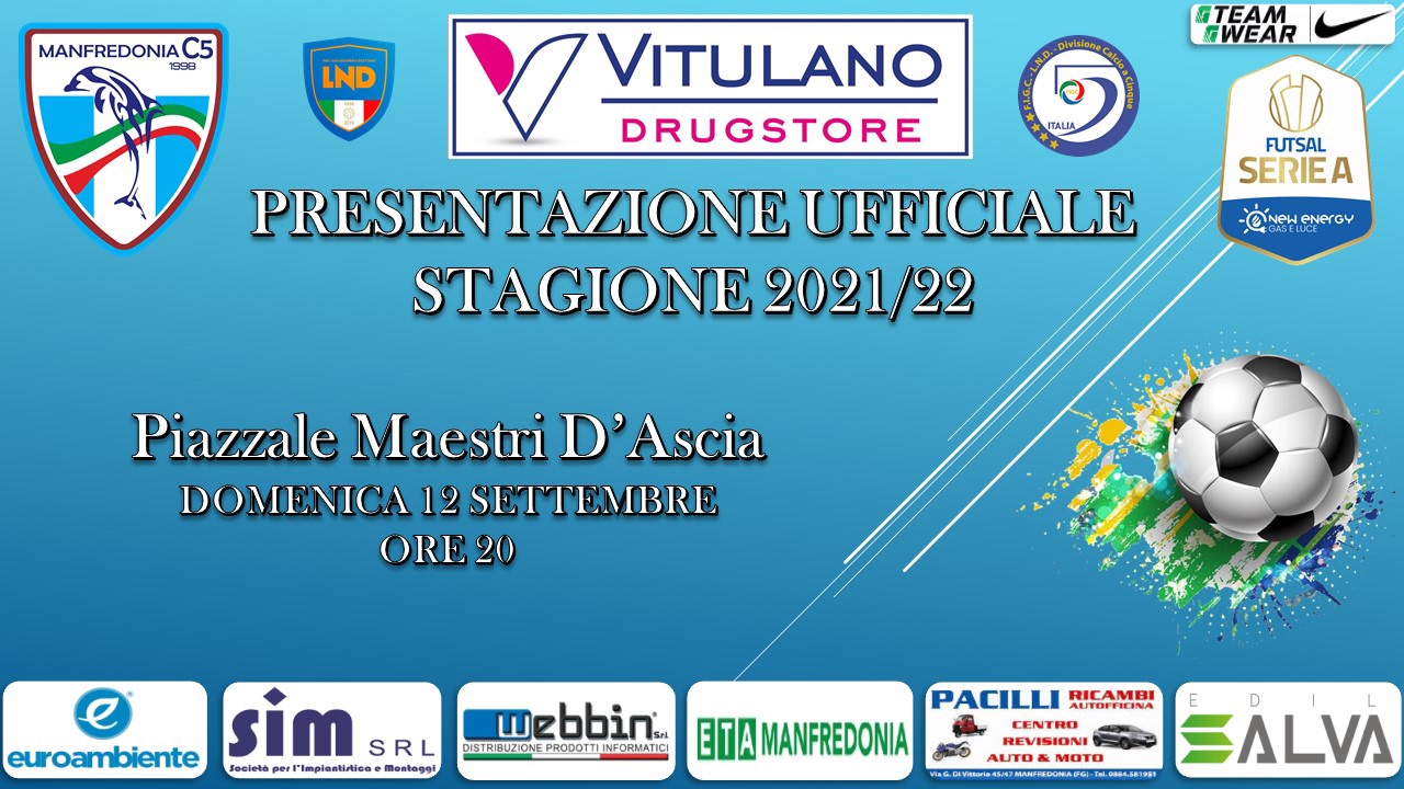 La Società Vitulano Drugstore C5 Manfredonia si presenta alla città. Il sodalizio sipontino, è lieto, infatti di comunicare che domenica 12 settembre, nella splendida cornice di Piazza Maestri D’Ascia alle ore 20.00, si terrà la presentazione ufficiale della squadra, che per la prima volta nella storia di Manfredonia, e prima società di Capitanata, affronterà il campionato nazionale di serie A di calcio a 5.