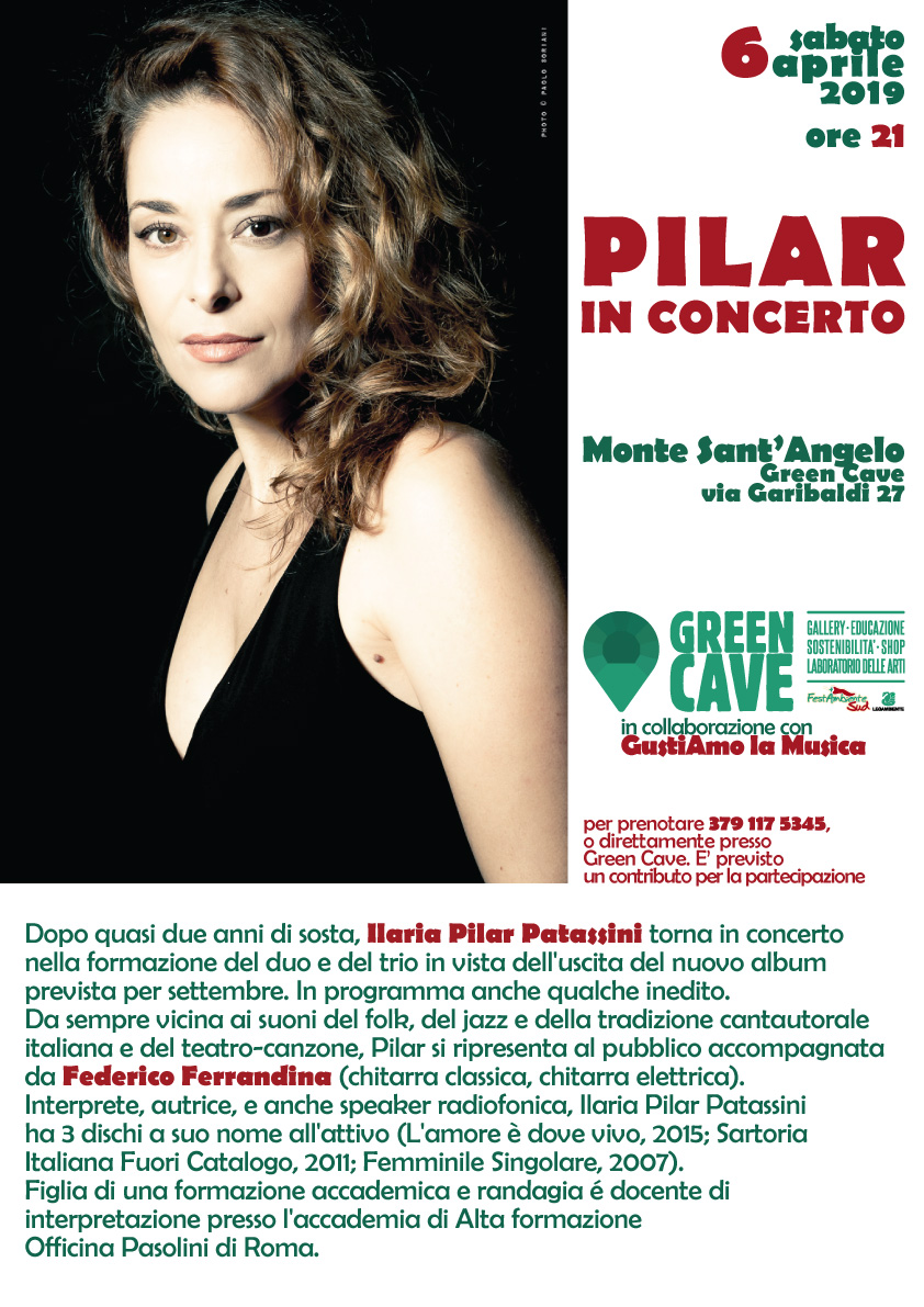 Concerto di Ilaria Pilar Patassini a Monte Sant’Angelo, accompagnata da Federico Ferrandina alle chitarre, alle ore 21 di sabato 6 aprile. Serata organizzata in collaborazione tra Green Cave di FestambienteSud e l’associazione GustiAmo la Musica.