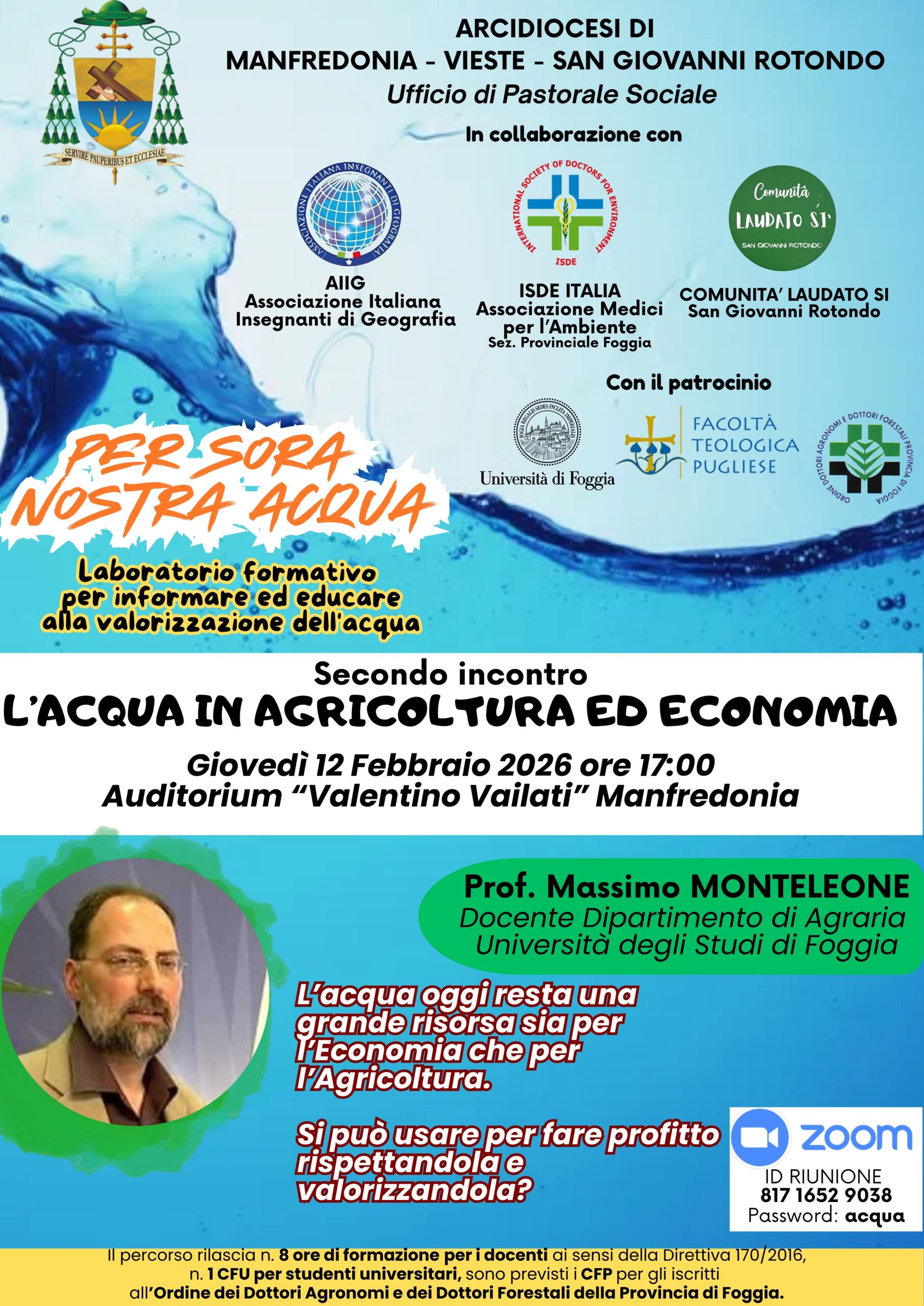 MANFREDONIA – Il secondo appuntamento del percorso “PER SORA NOSTRA ACQUA”, organizzato in collaborazione tra Arcidiocesi di Manfredonia – Vieste – San Giovanni Rotondo, Comunità Laudato Si di San Giovanni Rotondo, l’AIIG Foggia (Associazione Italiana Insegnanti di Geografia) e l’ISDE (Associazione Medici per l’Ambiente) della sezione di Foggia, si terrà giovedì 12 Febbraio dalle ore 17 alle 19 presso l’Auditorium “Valentino Vailati” di Manfredonia.