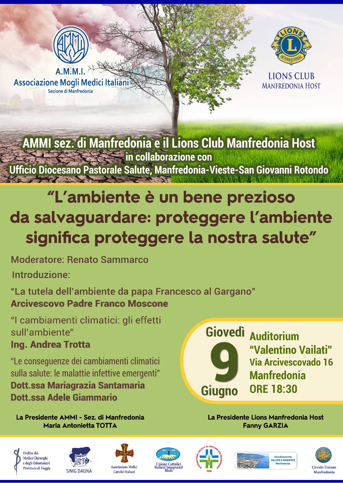 Il cambiamento climatico, a cui stiamo assistendo negli ultimi anni, determina come conseguenze: siccità, rischio sicurezza alimentare, catastrofi naturali, insorgenza e trasmissione di nuove malattie infettive ma anche aumenti di mortalità che si registranosoprattutto in estate. Allora ben venga l’incontro organizzato dall’AMMI (Associazione Mogli Medi Italiani) sezione di Manfredonia, dal Lions Club Manfredonia Host in collaborazione con l’Ufficio Diocesano Pastorale Salute Manfredonia-Vieste-San Giovanni Rotondo, per il 9 giugno prossimo alle ore 18.30 presso l’auditorio ” Valentino Vailati” in Manfredonia con l’intervento di illustri relatori.
