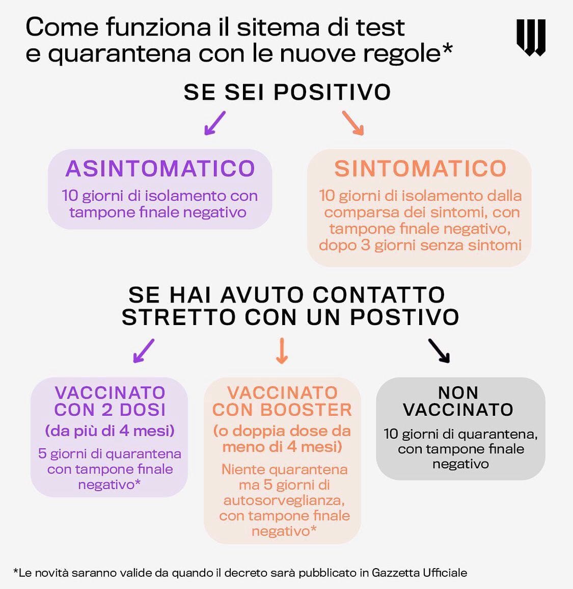 Le quarantene non saranno più previste per i vaccinati con booster o con due dosi da meno di quattro mesi che vengano a contatto con una persona poi risultata positiva al Covid, se asintomatici. In questi casi sarà prevista una forma di autosorveglianza e l’esecuzione, al quinto giorno dal contatto con il caso positivo, di un tampone con esito negativo.