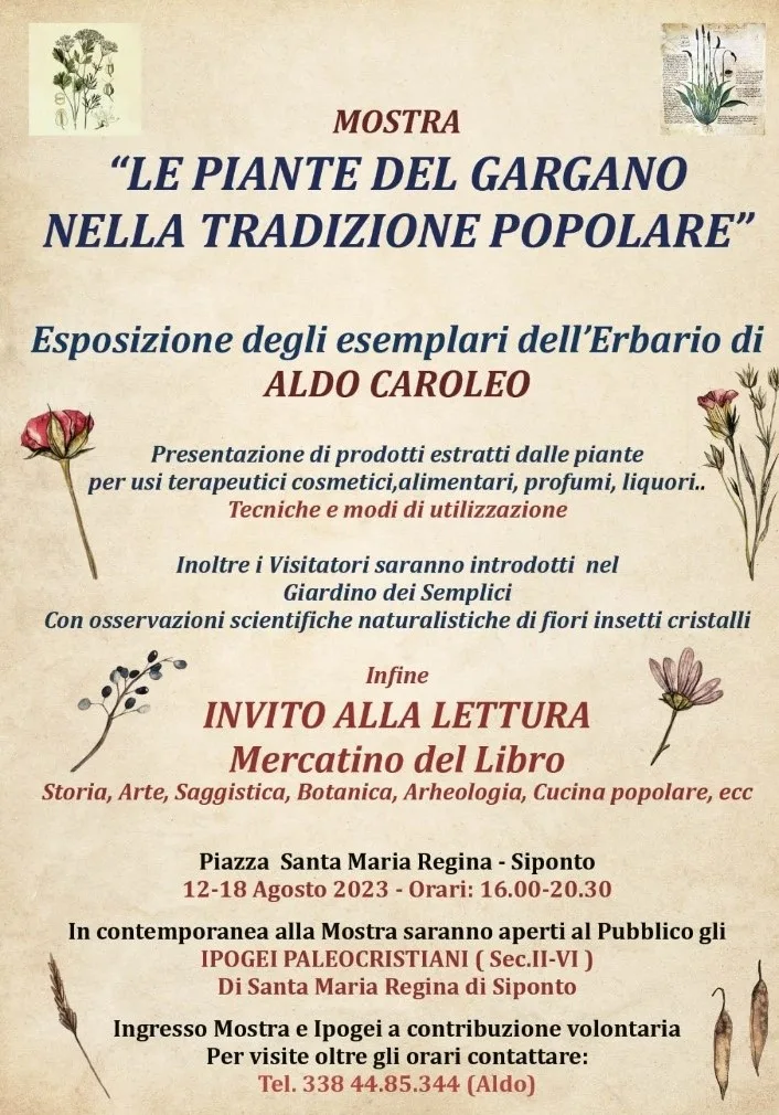 La Mostra e’ caratterizzata dalla presentazione in Erbario di esemplari di piante con proprietà curative ed alimentari e mangerecce, del territorio Daunio e limitrofi , utilizzate fin dai tempi antichi dalle popolazioni Garganiche.