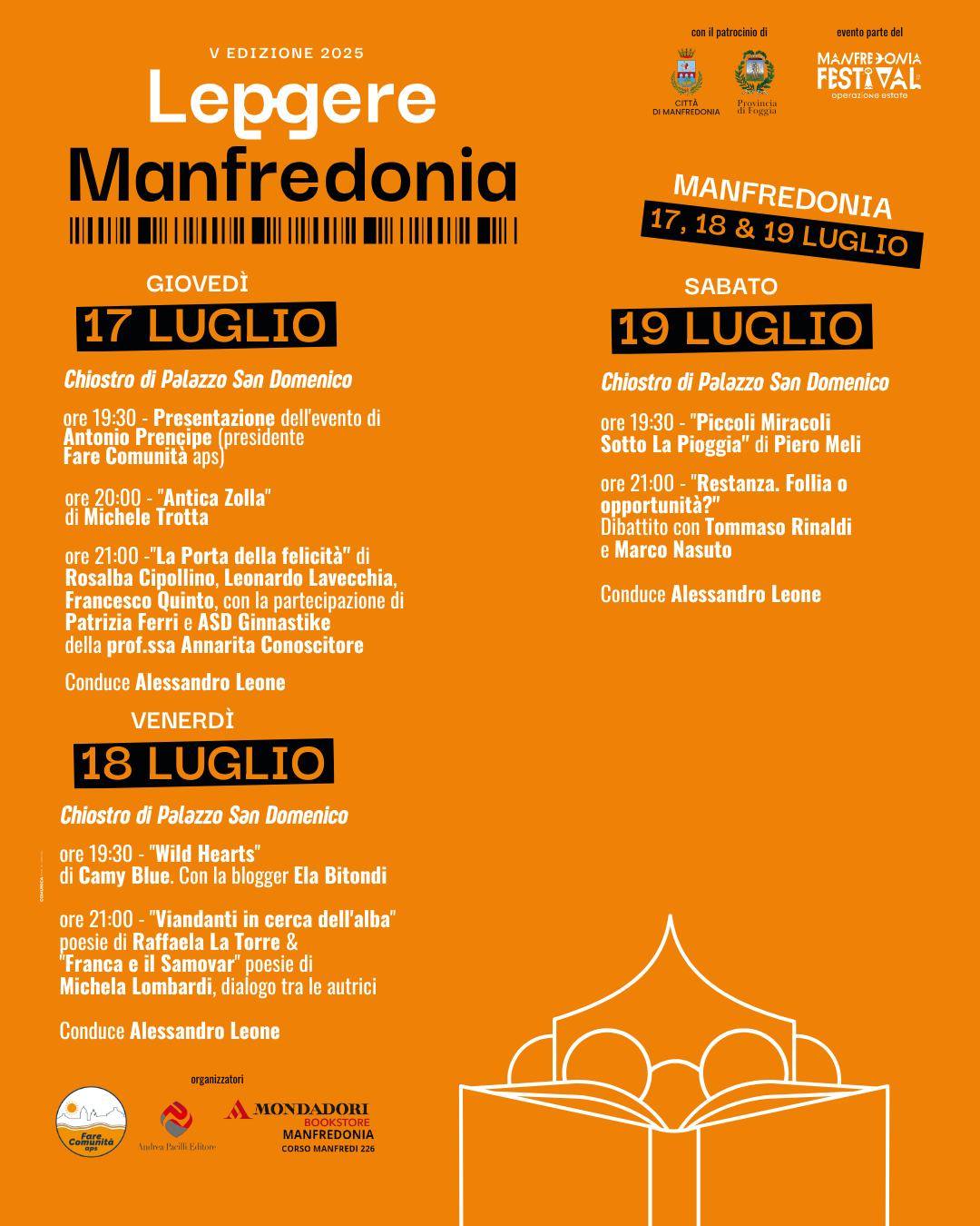 LEGGERE MANFREDONIA 2025 Ecco la locandina ufficiale della V Edizione! Ospiti d'eccezione, dibattiti d'attualità, nuove letture e tanta, tantissima cultura! Ogni giorno, nuovi contenuti per arrivare pronti agli eventi!