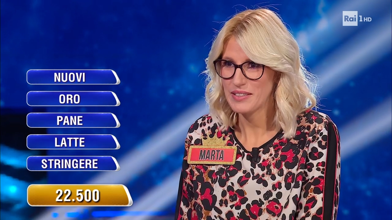 Questa volta è stata Marta a conquistare l’accesso alla Ghigliottina, dopo aver battuto Nicola nei 100 Secondi. La campionessa è partita con un montepremi di 180.000 euro, ridottosi poi a 22.500 euro.