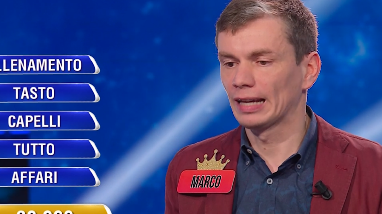 Alla Ghigliottina, gli indizi sono “Allenamento”, “Tasto”, “Capelli”, “Tutto” e “Affari”. Marco si prende tempo, valuta, prova a legare i significati e infine scrive “Duro”. La parola giusta, però, è “Volume”. Un epilogo amaro che gli nega la vincita, ma gli lascia il titolo di campione e la possibilità di riprovarci nella prossima puntata.