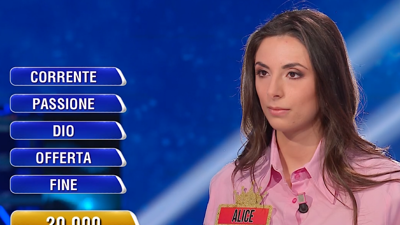 Le parole indizio erano “Corrente”, “Passione”, “Dio”, “Offerta” e “Fine”. Alice ha puntato sulla soluzione “Vento”, una scelta coerente ma purtroppo non vincente. La parola corretta, infatti, era “Settimana”. Una conclusione amara, ma con la consueta grinta che continua a contraddistinguere il percorso della campionessa.