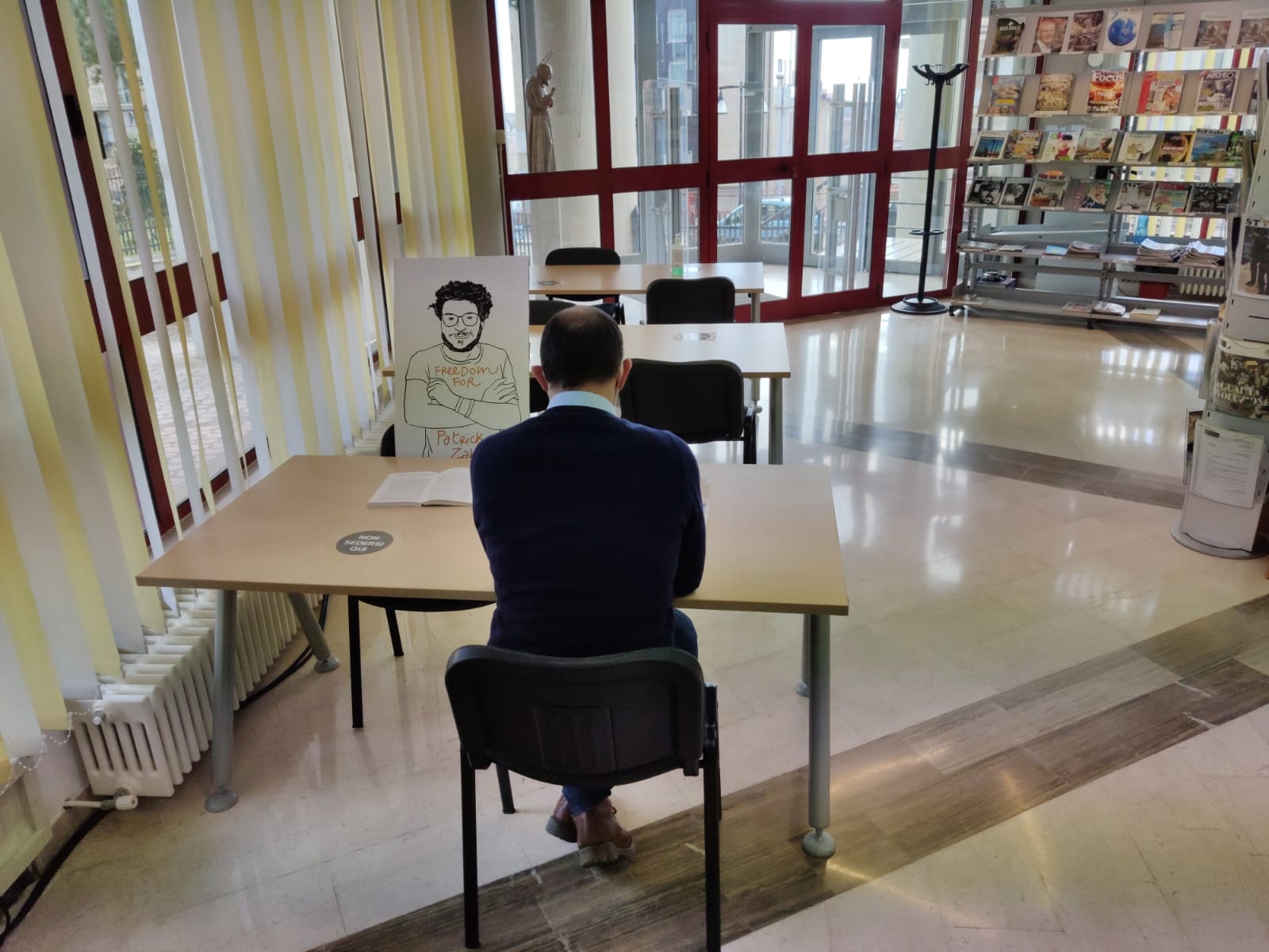 «Abbiamo letto dell’iniziativa dell’ateneo di Unibo e abbiamo pensato che fosse importante metterla in atto anche qui, nella nostra città – spiegano i bibliotecari Christian Palladino e Marco Tricarico –. Così abbiamo contattato l’artista Costantini che ha subito acconsentito affinché utilizzassimo il suo disegno per stampare e posizionare le sagome di Patrick. Vogliamo, in questo modo, dare un messaggio importante che sia anche di conoscenza della situazione di un ragazzo come noi, e di un tema, quello della violazione dei diritti umani, ancora troppo attuale nel 2021. Queste sue sagome, posizionate in mezzo ai ragazzi che quotidianamente si recano in biblioteca per studiare, hanno una valenza molto forte: siamo tutti Zaki e vogliamo che lui torni presto in aula a studiare con i suoi compagni».