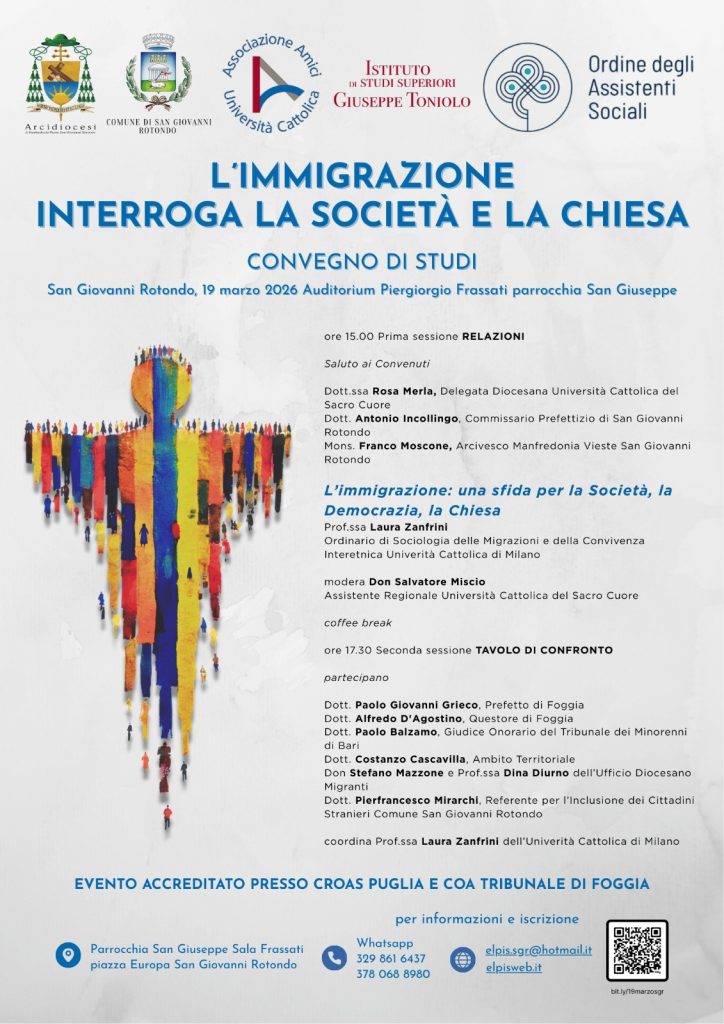 Giovedì 19 marzo 2026 alle ore 15.00, presso l’Auditorium Piergiorgio Frassati della Parrocchia San Giuseppe (piazza Europa) a San Giovanni Rotondo, si terrà il convegno di studi “L’immigrazione interroga la società e la Chiesa”.