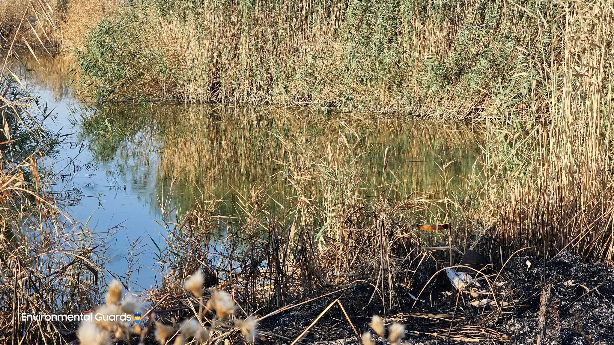 Le Guardie Ambientali Italiane, capeggiate dal responsabile Alessandro Manzella, durante un sopralluogo tra le zone devastate dall’incendio all’Oasi Lago Salso, in mezzo al canneto annerito e alla distruzione, hanno notato qualcosa che ha lasciato l’amaro in bocca: una sedia, usata dai bracconieri ittici, ancora intatta.