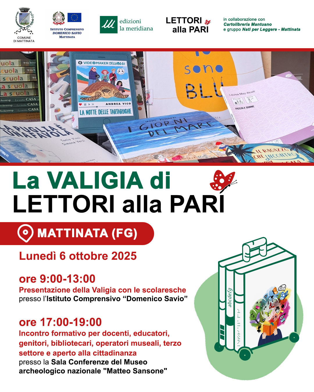 Alle ore 17:00, presso la Sala Conferenze del Museo Archeologico Nazionale di Mattinata “Matteo Sansone”, si terrà un incontro pubblico, gratuito e aperto a tutta la cittadinanza e in particolare a docenti, educatori, genitori, bibliotecari, operatori museali e operatori del terzo settore, dedicato alla scoperta e alla formazione sui libri accessibili.