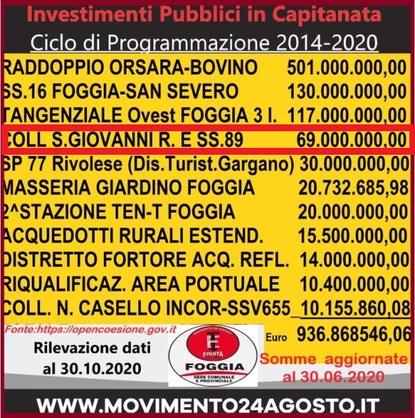 Negli ultimi 18 mesi il Movimento24A-ET, che ha come ispiratore e fondatore lo scrittore meridionalista Pino Aprile, ha più volte sollecitato la necessità urgente e ineludibile al presidente della Provincia di Foggia Nicola Gatta, con lettere e PEC, di effettuare una ricognizione complessiva, peraltro ampiamente diffusa anche dai media più attenti, per pressare le Aziende e gli Enti preposti a far realizzare tutta una serie di interventi ed opere infrastrutturali, programmate da anni con finanziamenti individuati, ma con progetti ancora in itinere e cantieri non aperti.