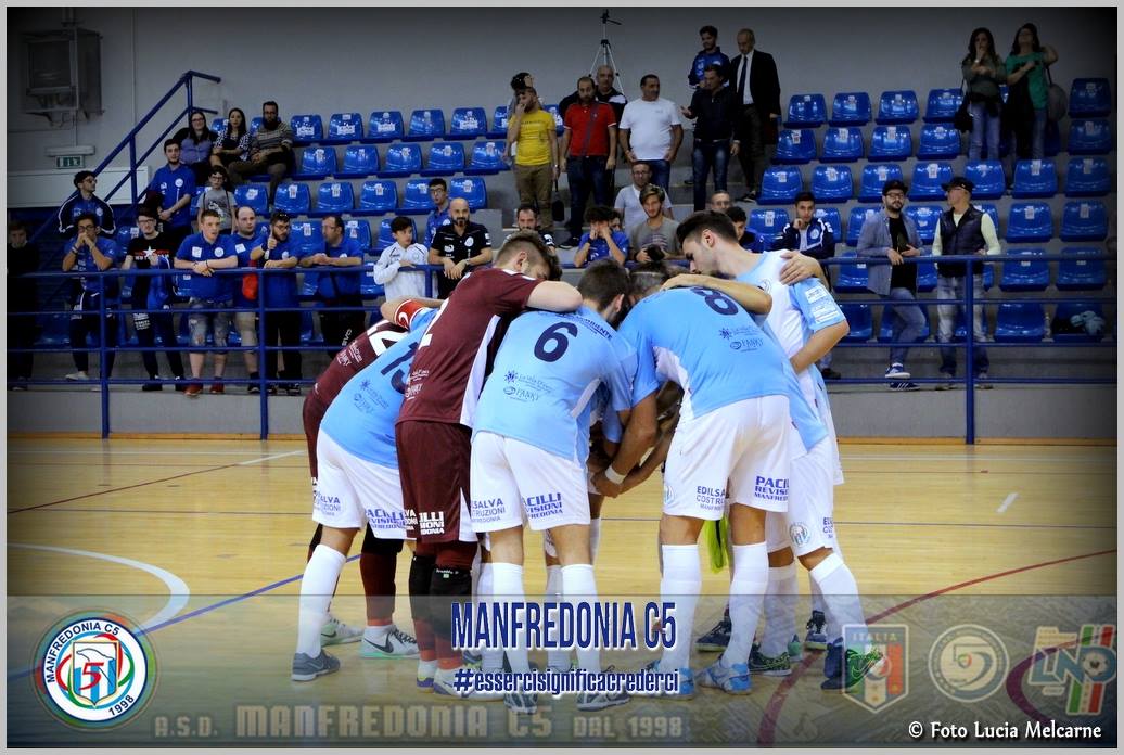 Essere capolista alla seconda giornata di campionato può sembrare banale, ma fa tanto bene al morale sopratutto se corrisponde ai valori ed ai risultati dimostrati sul campo di gioco. Così il Manfredonia C5 si ritrova a punteggio pieno (in coabitazione con il Tombesi Ortona) dopo la splendida vittoria casalinga per 7-3 contro il Real Dem Montesilvano. Quella del PalaScaloria è stata una partita dominata in lungo ed in largo, dall’inizio alla fine, dai ragazzi di Mister Miki Grassi, che, però nel primo tempo hanno masticato amaro per essere andati addirittura in svantaggio con i soli tre tiri nello specchio della porta da parte degli ospiti. Un dominio tecnico e tattico quello biancoceleste che, nonostante, le numerose nitide occasioni da gol, riescono a sbloccare solo all’11° grazie ad un gol di Sperendio ed al 14° con Jaouad. Ma, il cinico Real Dem, nel giro di un solo minuto, tra il 14° ed il 15°, con i primi due tiri della partita riagguanta il pareggio con Rosato e Di Muzio. Mentre il Manfredonia C5 prova il tutto per tutto per tornare meritamente in vantaggio, sono gli ospiti al 17° con un contropiede fulminante ad andare incredibilmente in gol con Dos Santos Martins. All’ultimo minuto della prima frazione di gioco, il sesto fallo degli abruzzesi regala il tiro libero realizzato da Abraham per il meritato pareggio.
