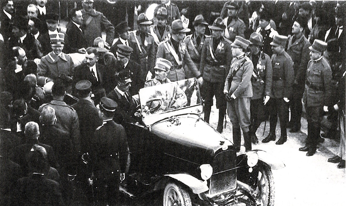 Visita del principe Umberto di Savoia a sinistra in fondo sull’auto regale, davanti a lui è seduto il sindaco cavalier Simone. Bisogna premettere che, dopo la Marcia su Roma, vi erano state nuove elezioni amministrative, ovviamente falsate, che portarono all’elezione come sindaco del solito Cavalier Ufficiale Simone e, come consigliere provinciale,dell’avvocatoFrancesco De Padova che si presentò nella lista del fascio, quantunque, precedentemente, e non sarà l’unico caso,veniva considerato antifascista. Il ricevimento indetto in onore dell’erede al trono fu preceduto da un corteo e il principefu accompagnato dal neo consigliere provincialeavv. De Padova che venne fischiato durante il tragitto. Un commerciante, ex fascista, fu arrestato per aver protestato contro i suoi vecchi compagni fascisti, <<Due altri ex bollenti