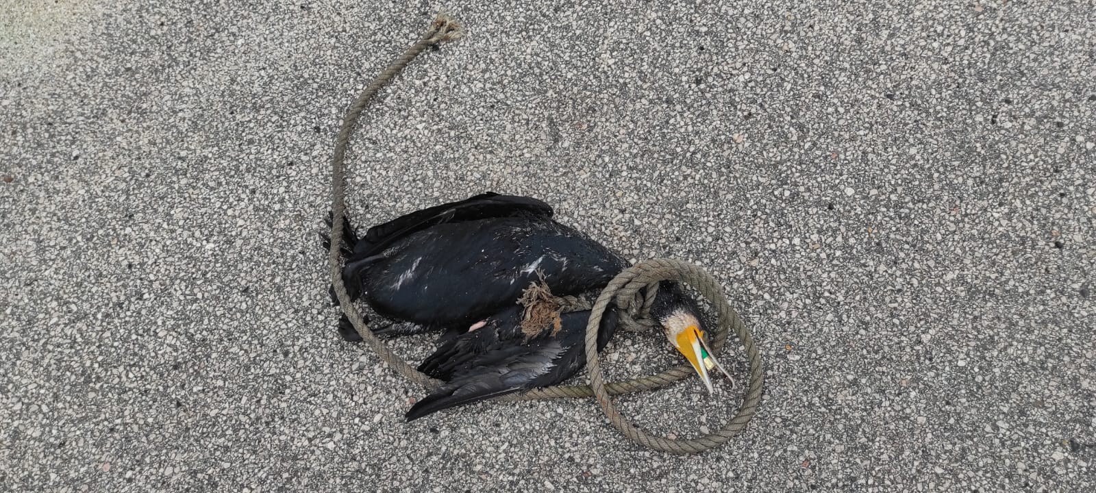 Stamattina in prossimità dell’ingresso dell’Oasi Lago Salso è stato ritrovato un cormorano con una fune legata intorno al collo e una cartuccia da caccia nel becco.