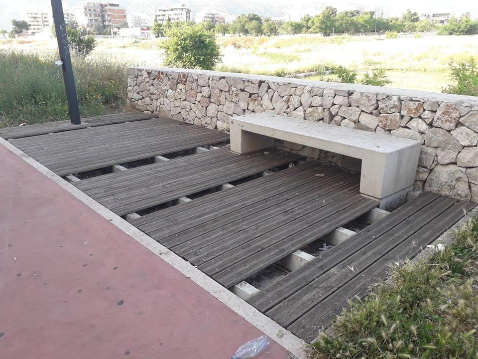 La situazione è pericolosa per i bambini che frequentano la zona: ignoti hanno divelto il pavimento in legno attorno alle panchine del vialetto.
