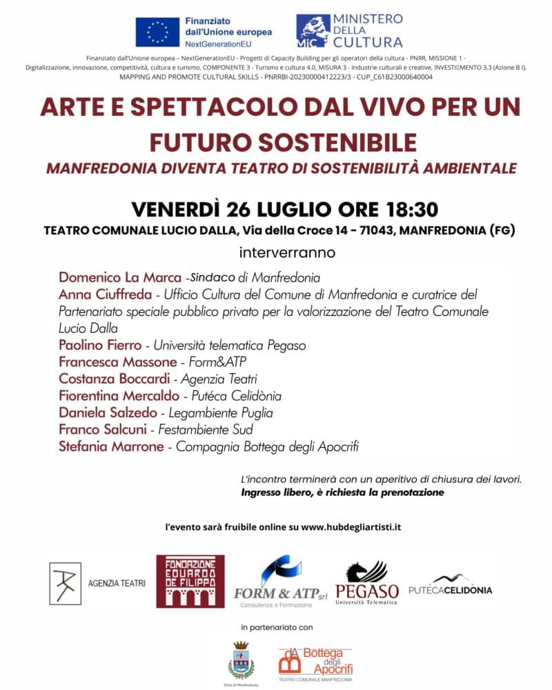 Venerdì 26 luglio il Teatro Comunale “Lucio Dalla” ospiterà l’incontro pubblico “Arte e spettacolo dal vivo per un futuro sostenibile”, organizzato da Form&APT di Napoli, Università telematica Pegaso, Agenzia Teatri, Associazione Putéca Celidònia, Fondazione Eduardo De Filippo e compagnia Bottega degli Apocrifi, in sinergia col Comune di Manfredonia.