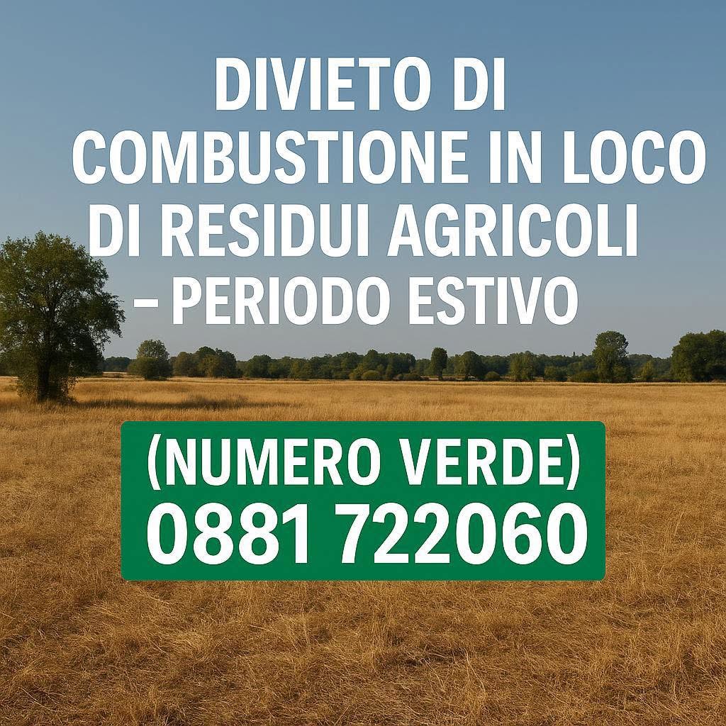 Il Sindaco informa la cittadinanza e gli operatori agricoli che dal 14 agosto al 30 settembre è in vigore su tutto il territorio comunale il divieto assoluto di bruciare in loco residui vegetali derivanti da attività agricole e orticole, inclusi stocchi e piante di pomodoro a fine ciclo.