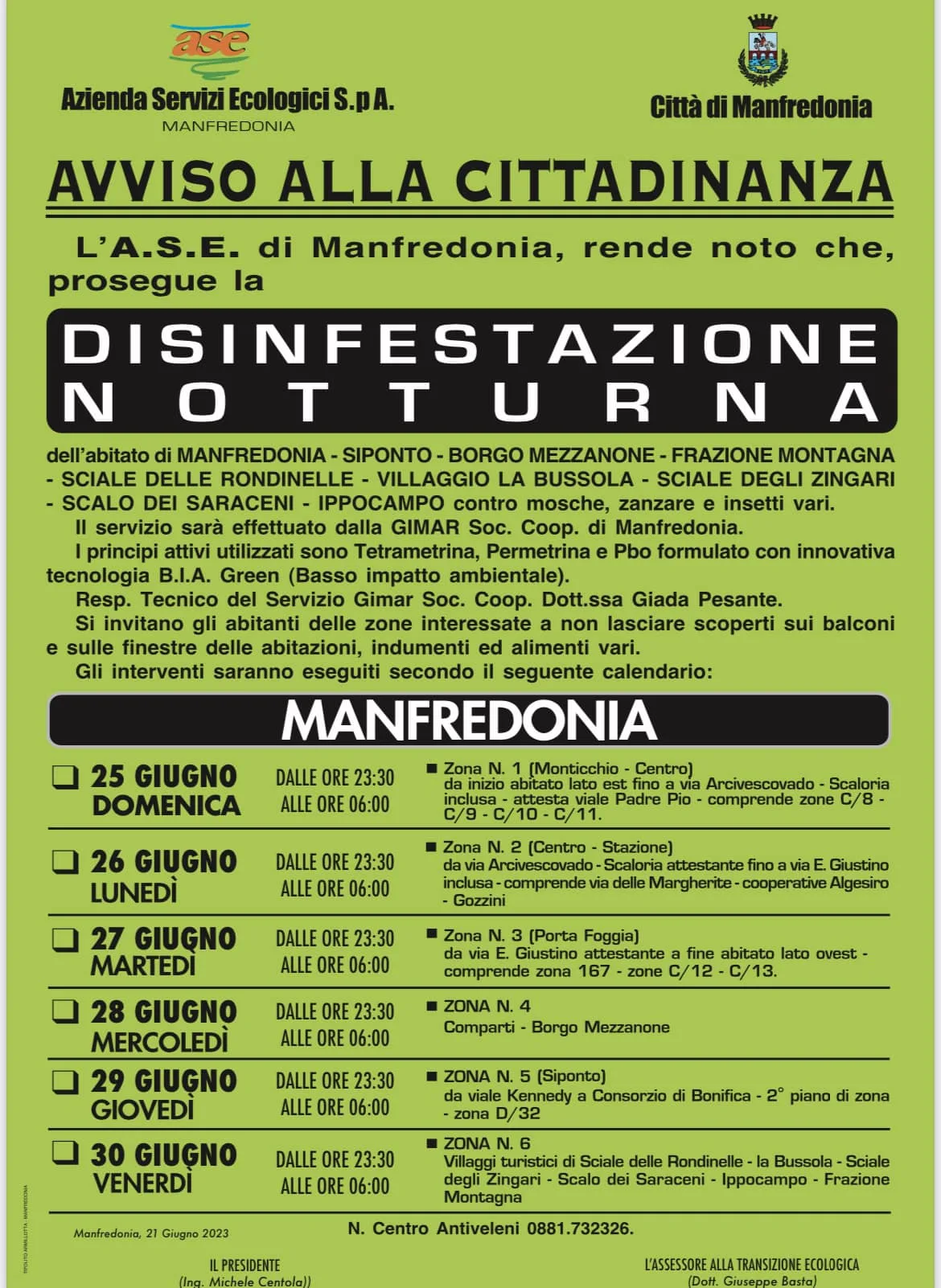 Inizia domenica 25 giugno il terzo degli otto trattamenti di disinfestazione estiva contro mosche, zanzare e insetti vari nel territorio di Manfredonia (comprensivo di Siponto, Borgo Mezzanone, Fraz.Montagna, Sciale Rondinelle, Sciale degli Zingari, Villaggio La Bussola, Scalo dei Saraceni, Ippocampo).