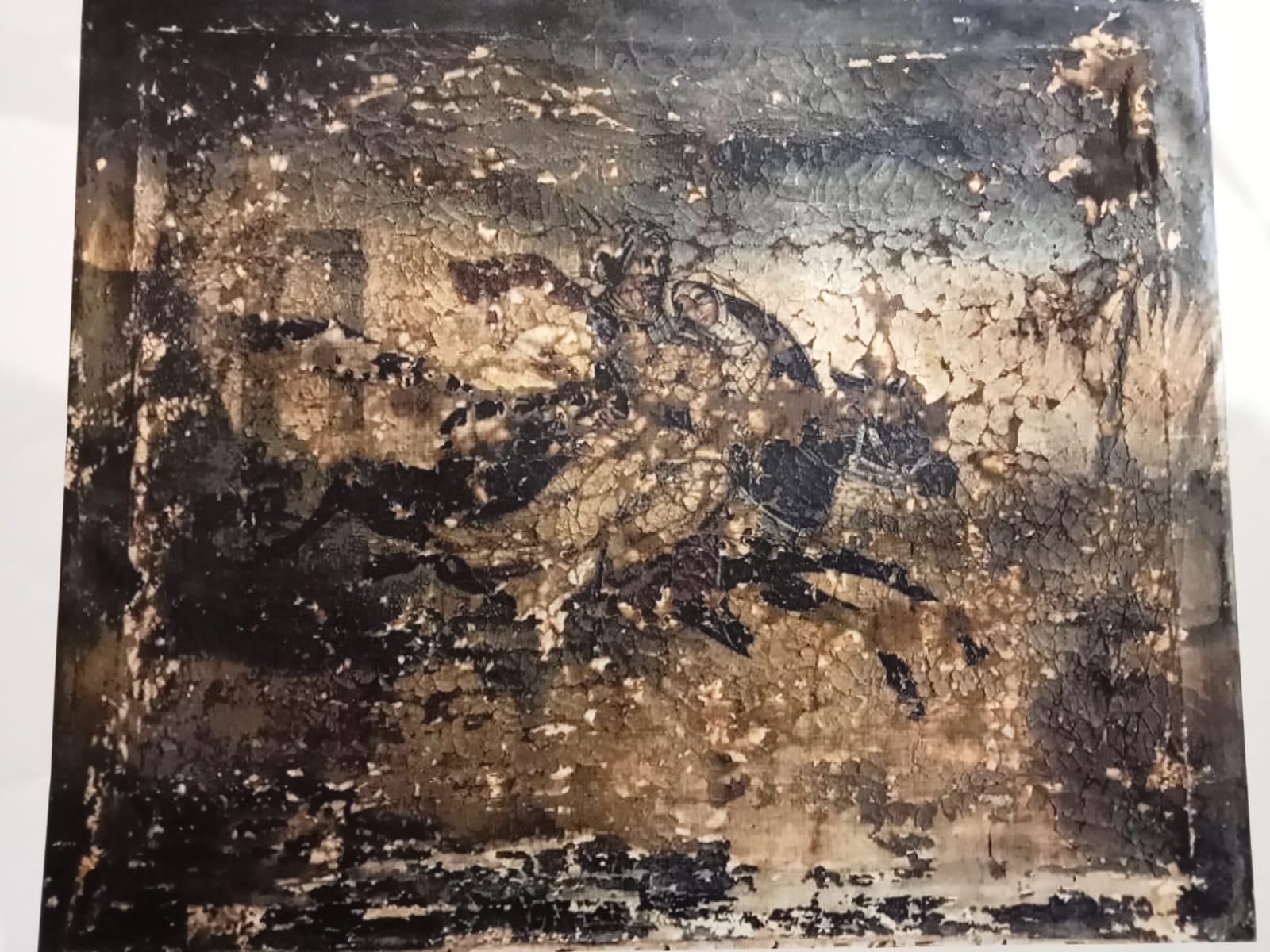 La scena dipinta – una giovane religiosa rapita da un soldato turco con la città di Manfredonia sullo sfondo – rimanda alla vicenda storica di Giacometta Beccarini, educanda delle Clarisse, catturata durante il saccheggio del 1620 e condotta a Istanbul come prigioniera. Un’immagine che restituisce, con immediatezza, una ferita ancora viva nella memoria storica sipontina.