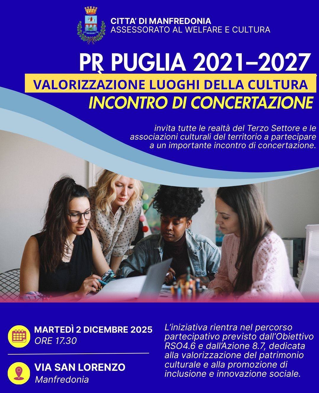 L’Assessorato al Welfare e Cultura convoca le realtà culturali, associative e sociali del territorio ad un incontro di concertazione dedicato alla valorizzazione dei luoghi culturali cittadini e al potenziamento della partecipazione attiva.