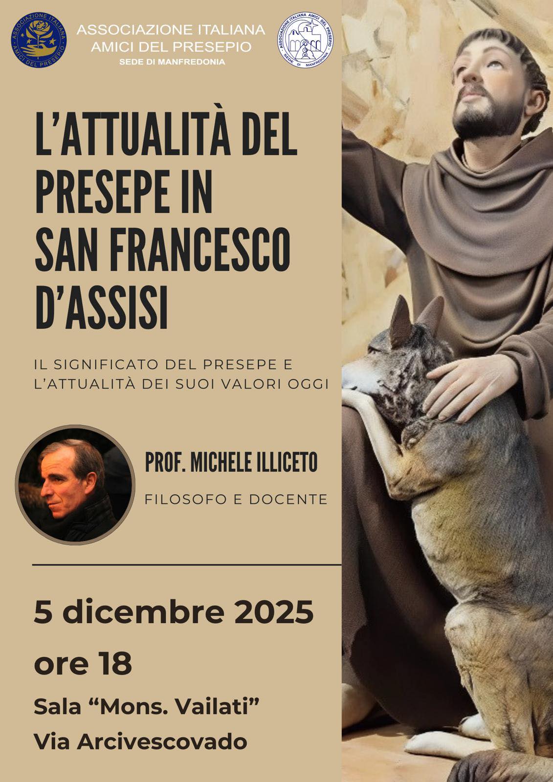 Il presepe un messaggio che parla ancora oggi. A Manfredonia un incontro speciale per riscoprirne il significato attraverso lo sguardo di San Francesco d’Assisi. L’attualità del presepe in San Francesco d’Assisi Con il Prof. Michele Illiceto filosofo e docente.