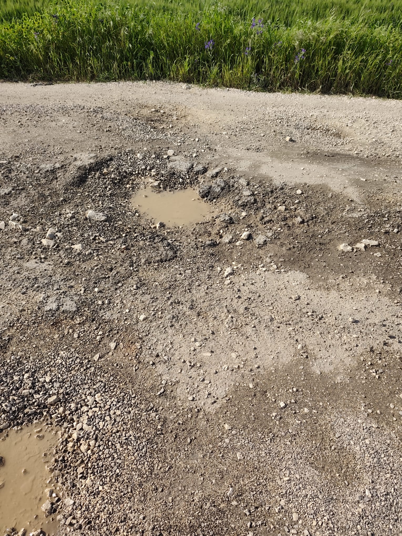 Il manto stradale risulta fortemente dissestato con numerose buche profonde distribuite lungo tutta la carreggiata. In molti punti, queste sono colme d’acqua stagnata, rendendo impossibile valutare la profondità e aumentando il rischio di danni ai veicoli e di perdita di controllo.