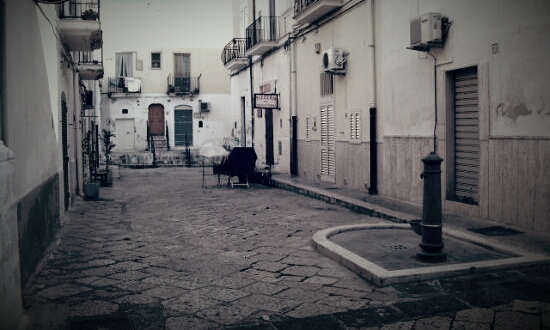QUELL’ALBA la strada era come un corridoio a parabola, di marmo bucato e pietroso, pavimentata, non esisteva il marciapiede, le case livellate alla medesima. Sotto uno scalino di qualche porta c’era un piatto di pasta secco dall’aria da qualche giorno in quel piccolo largo, il cortile a tre pareti di facciata ! Con la pioggia che scrosciava giù gonfia e torbida ,nell’ora che prendeva largo verso l’Isola di Tremiti la chiatta carica di alimenti ! Una giacca scorreva con l’acqua abbandonata per terra come stoffa straccia,come una pezza ,con una macchia rossa che colorava una petunia; rivoli ingombranti scendevano con petulanza all’altezza dei gradini dei portoni ed entrava nelle case a pianterreno, prendeva la via verso il Comune e la chiesa di San Domenico.