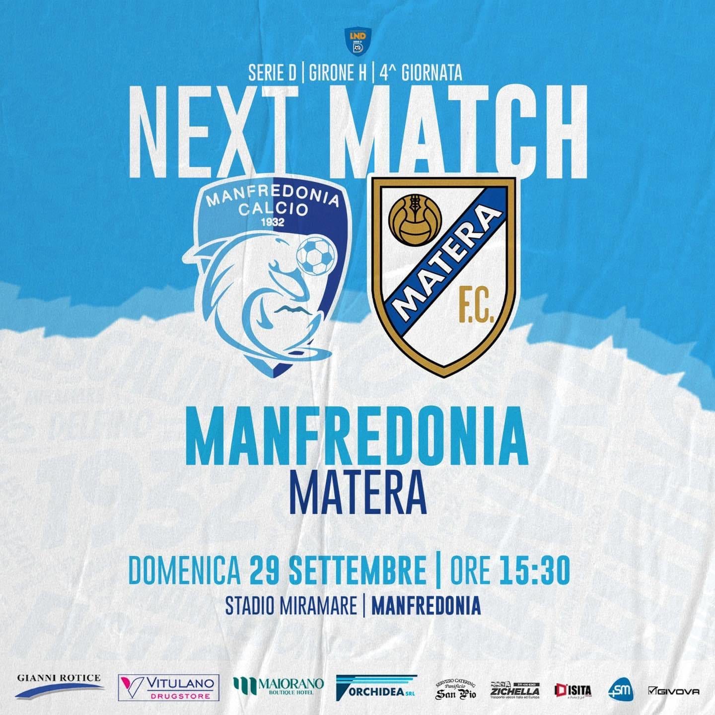 Manfredonia-Matera domenica 29 settembre alle ore 15.30