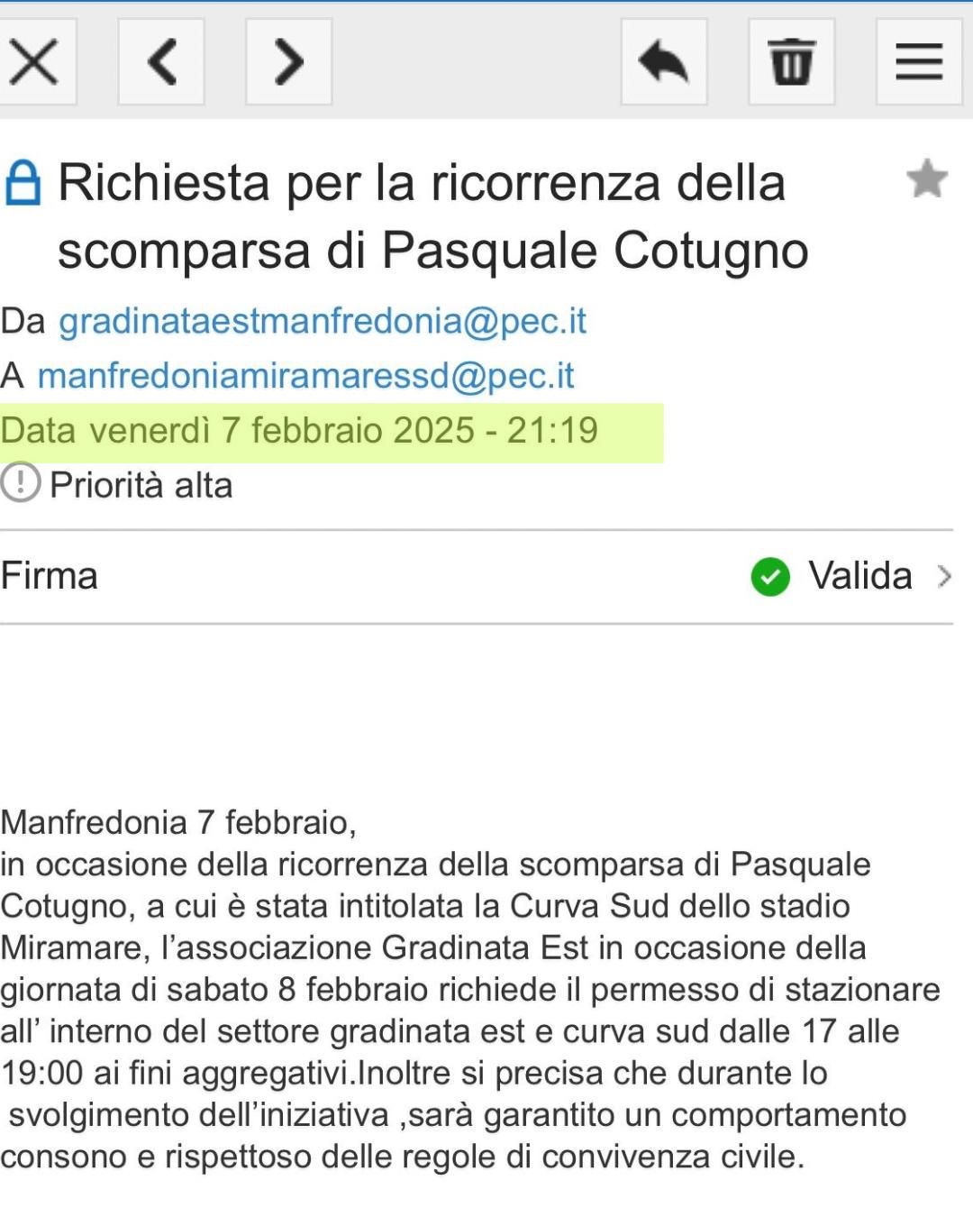 Ci chiediamo i motivi per i quali i referenti della “Gradinata Est”, che certamente si sono alacremente prodigati settimane prima per l’organizzazione dell’evento in memoria del compianto tifoso Pasquale Cotugno, non hanno contattato e reso edotta per tempo la “Manfredonia Miramare” delle volontà e necessità di utilizzare gli spazi dell’impianto in quella giornata, così come hanno fatto con altri soggetti coinvolti in quella giornata in altre location come il Comune di Manfredonia (Cimitero e LUC) e le Forze dell’Ordine.