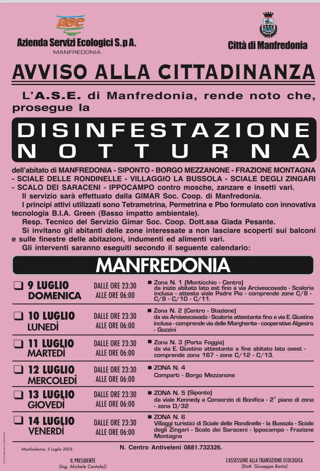 Inizia domenica 9 luglio il quarto degli otto trattamenti di disinfestazione estiva contro mosche, zanzare e insetti vari nel territorio di Manfredonia (comprensivo di Siponto, Borgo Mezzanone, Fraz.Montagna, Sciale Rondinelle, Sciale degli Zingari, Villaggio La Bussola, Scalo dei Saraceni, Ippocampo).
