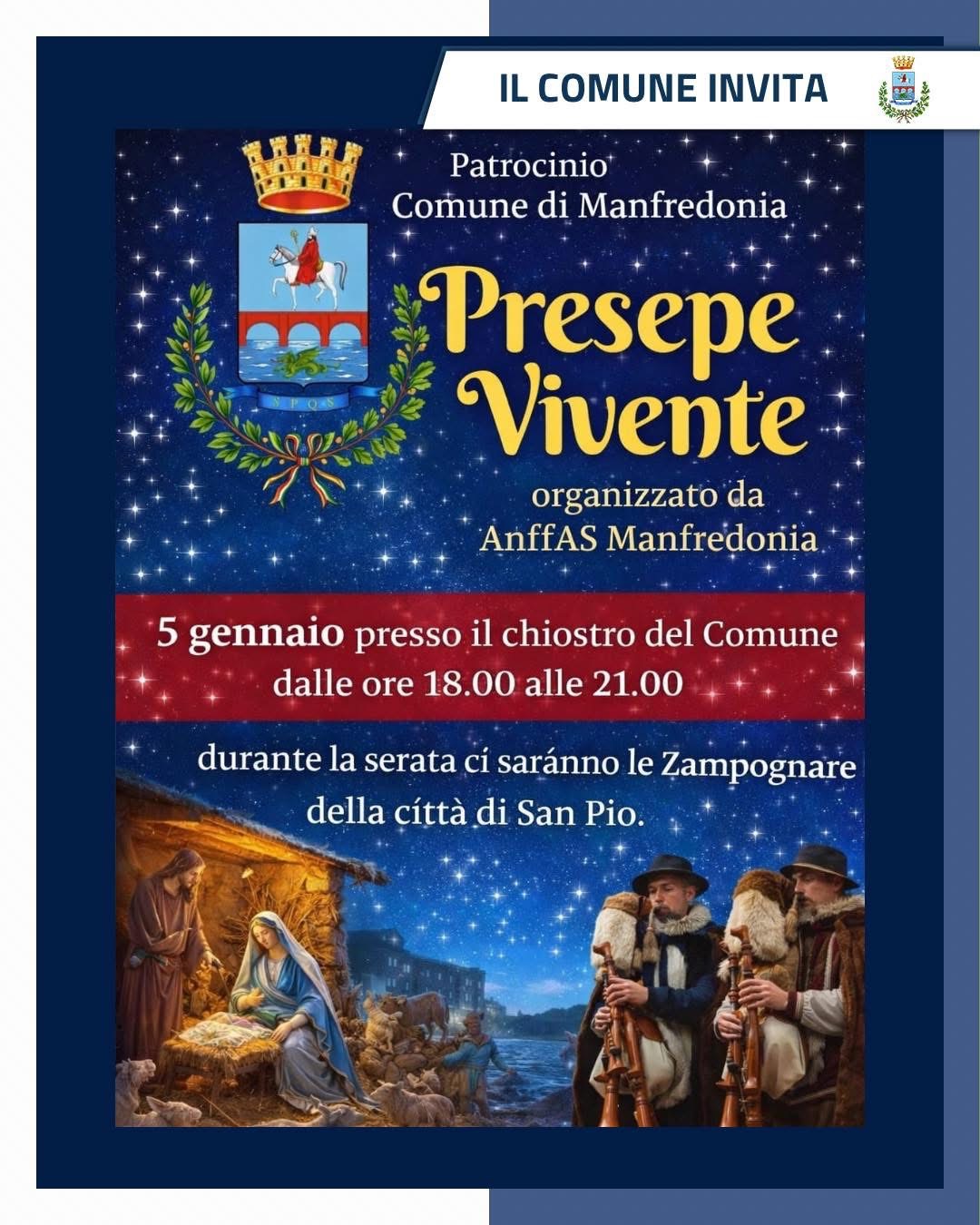 Oggi, 5 gennaio, il Chiostro del Comune di Manfredonia si anima di tradizione, inclusione e magia natalizia con il Presepe Vivente, organizzato da ANFASS Manfredonia.