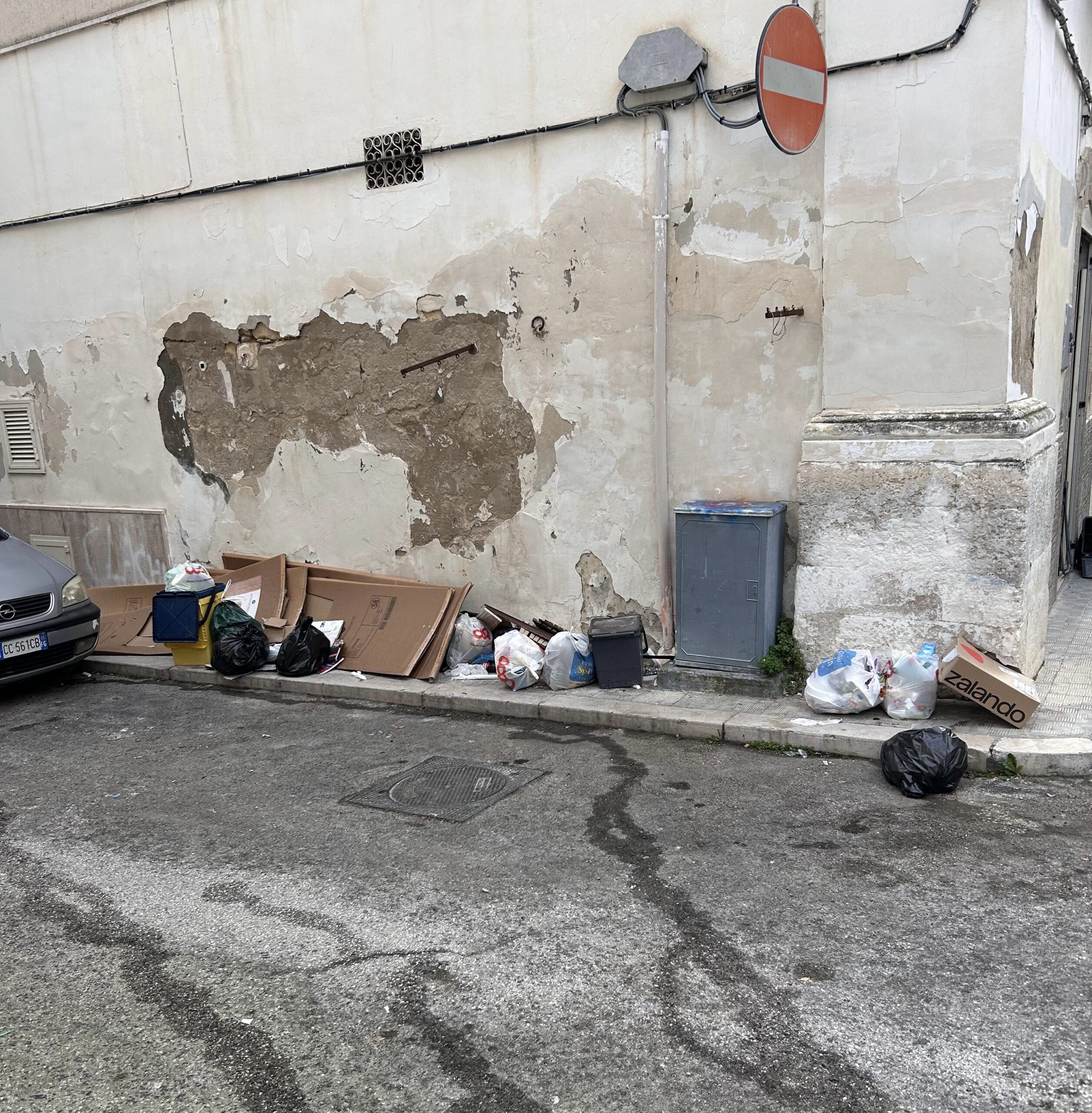 Ci troviamo in via delle Benedettine, strada situata in pieno centro storico, che da tempo è diventata un centro raccolta rifiuti di tutto il quartiere, dove ognuno si sente legittimato ad abbandonare rifiuti di ogni genere, rendendo la zona indecorosa e maleodorante attirando nelle ore notturne animali randagi e roditori. Tale situazione sta alterando le condizioni igieniche sanitarie della zona e potrebbe diventare un vero problema per la salute pubblica.
