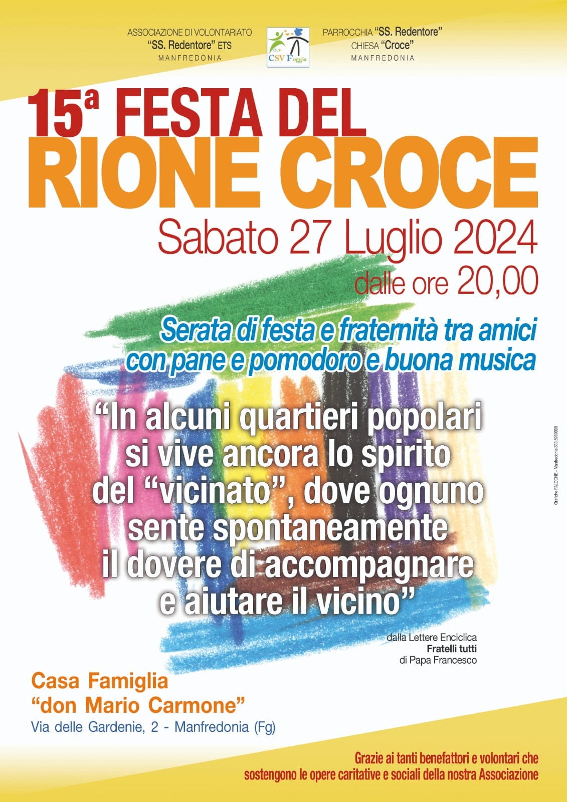 “La ‘Festa del Rione Croce’ – sottolinea il presidente del CSV Foggia, Pasquale Marchese – è diventata un appuntamento imperdibile per la comunità manfredoniana, un momento di aggregazione che combatte l’isolamento e favorisce l’inclusione sociale. Tutti sono invitati a partecipare e a condividere questo momento di festa e solidarietà con i volontari dell’associazione SS. Redentore”.