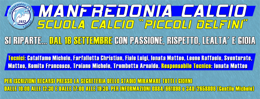 Riparte la Scuola Calcio “Piccoli Delfini” della S.S.D. Manfredonia Calcio. Riparte, dal 18 Settembre, lunedì e giovedì, divisi in due turni, dalle 17:00 alle 18:30 e dalle 18:30 alle 20:00.