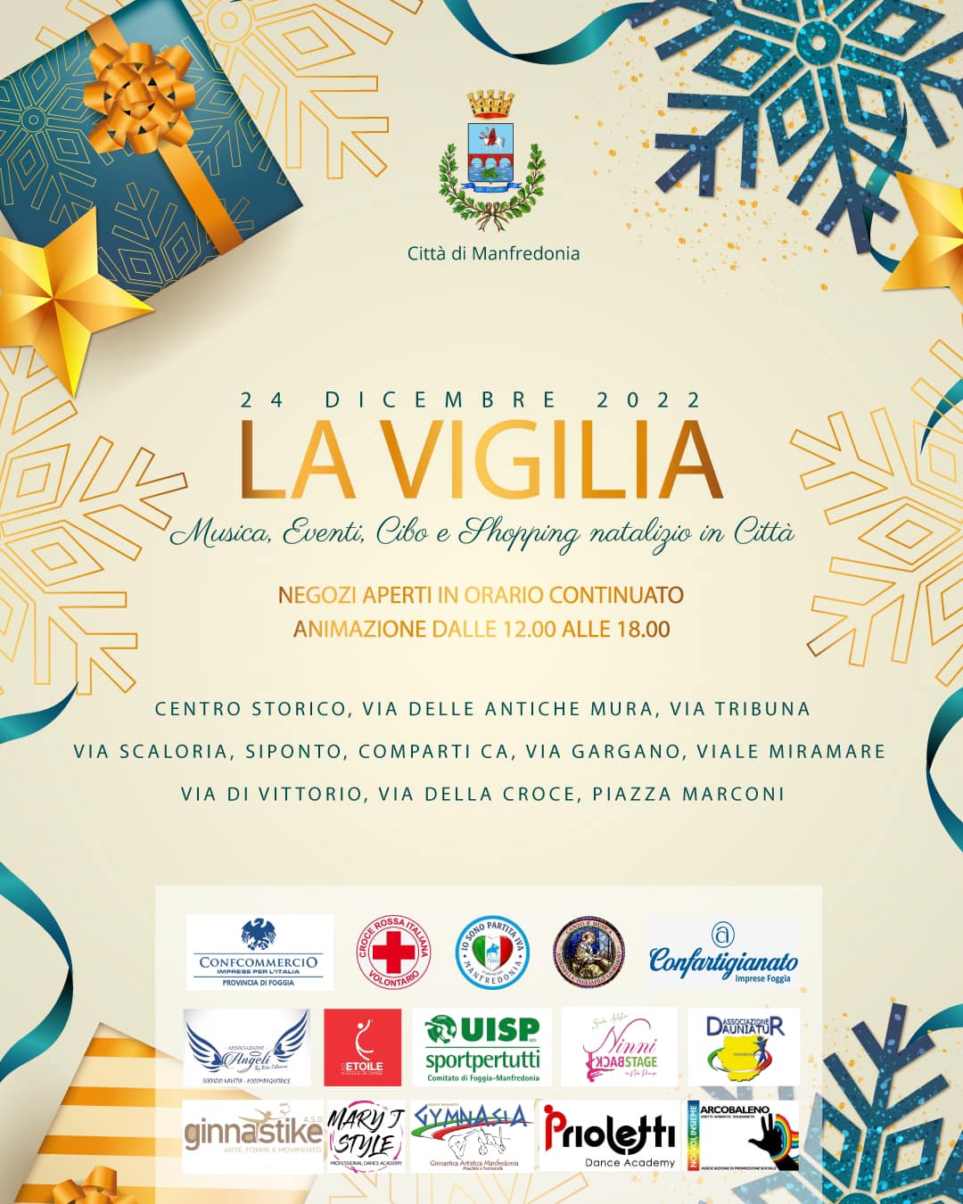 Dalle ore 10 alle ore 18 il clima natalizio si respirerà in ogni quartiere: Via delle Antiche mura,Via Tribuna, Via Scaloria, Siponto, Comparti CA, Via Gargano, Viale Miramare, Via Di Vittorio, Via della Croce, Piazza Marconi. Le attività commerciali, in orario continuato, animeranno le vie con musica, eventi, cibo e shopping.