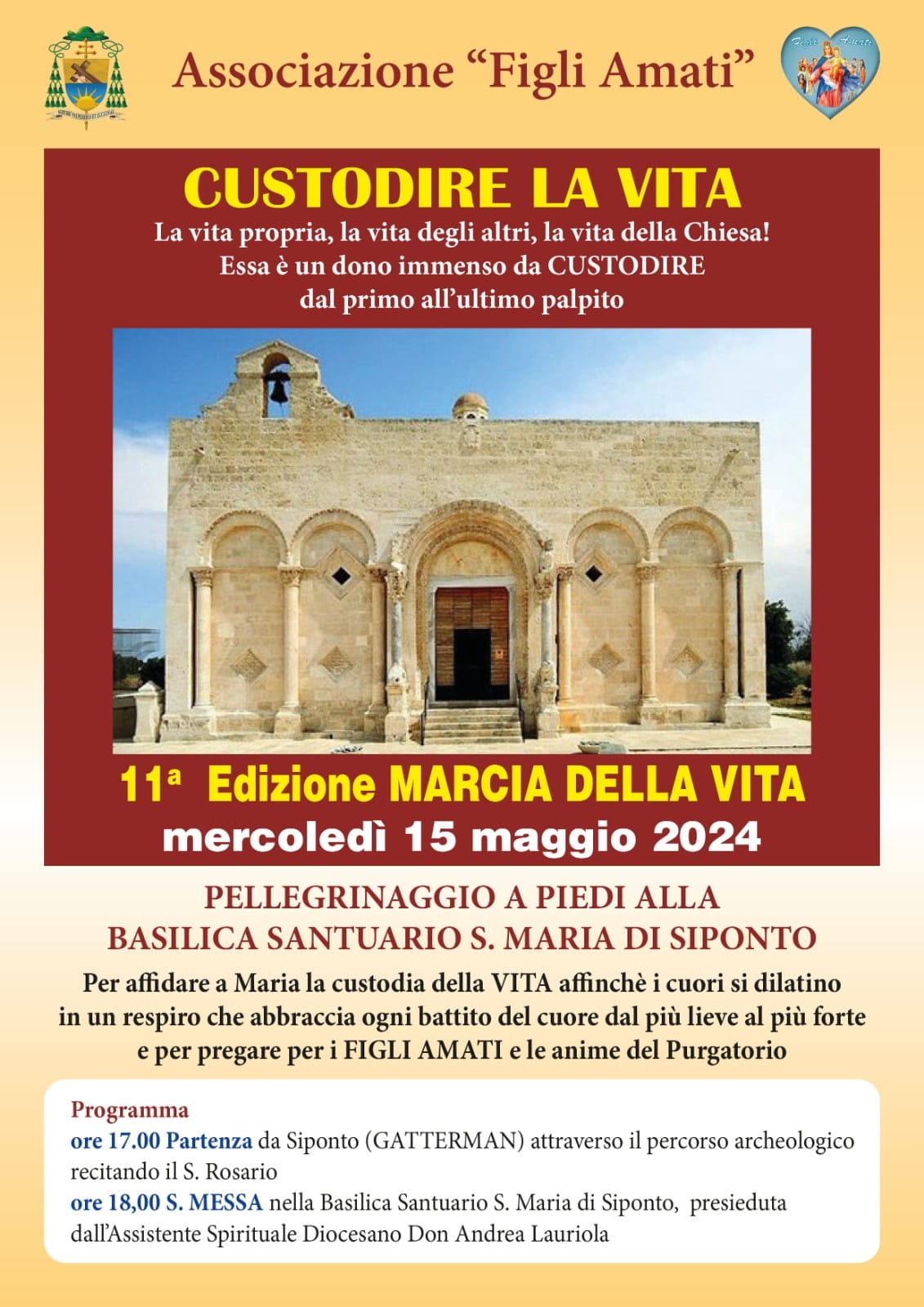 Nel mese di maggio, anche quest’anno, mercoledì 15 maggio verrà vissuto un giorno di speciale preghiera per i FIGLI AMATI e per i cari defunti per affidare alla Madonna di Siponto, la custodia della VITA affinchè i cuori si dilatino in un respiro che abbraccia ogni battito del cuore dal più lieve al più forte.