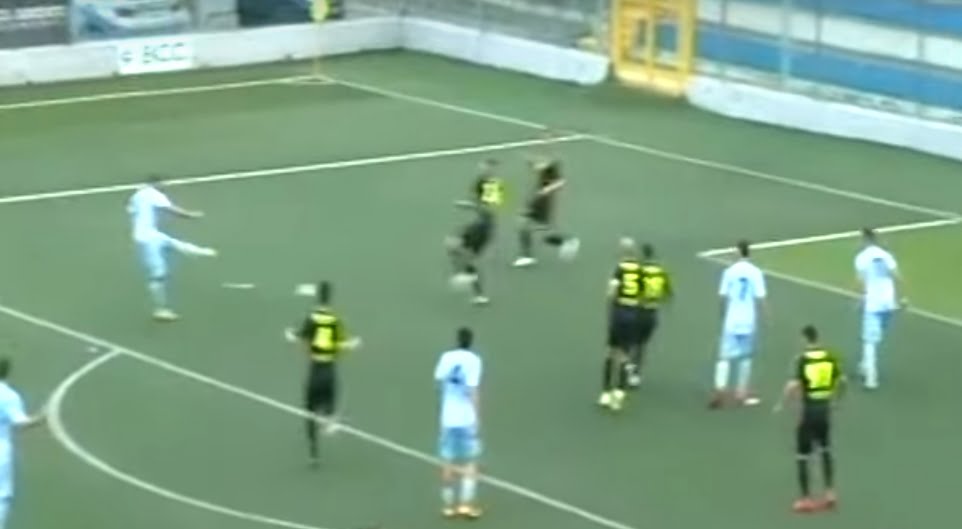 In questa istantanea De Giosa ha appena fatto partire un tiro (il pallone è a due metri da lui, già calciato) e il numero 11 del Manfredonia La Forgia è tenuto in gioco da un tarantino che lo tiene in linea per circa un metro.