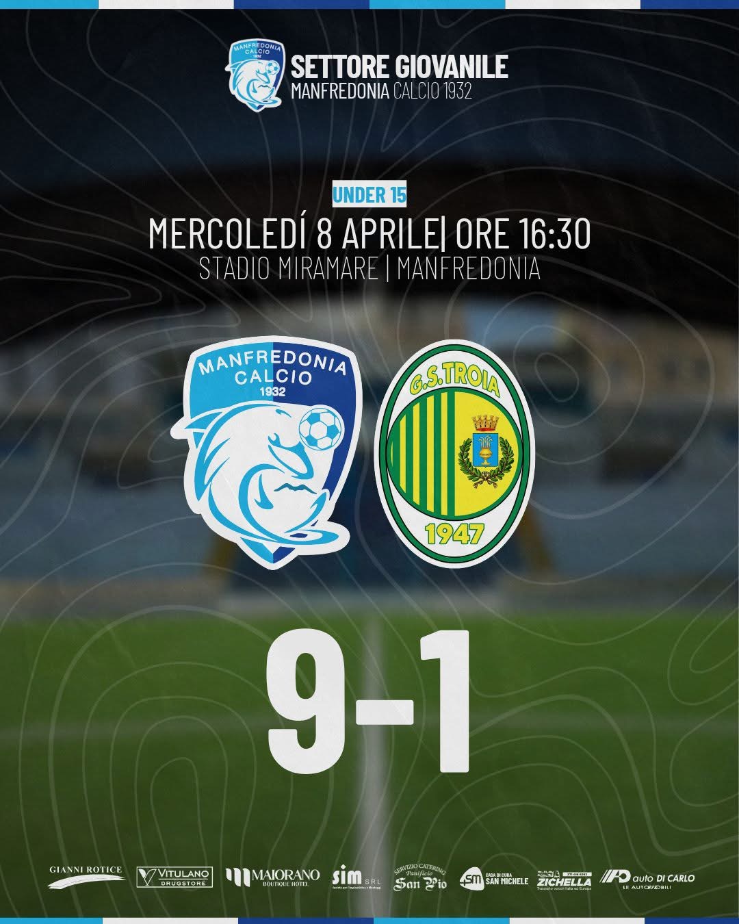Si è disputato oggi pomeriggio allo stadio “Miramare” il recupero della 10ª giornata del campionato Under 15 tra Manfredonia Calcio 1932 e Troia. La gara, precedentemente rinviata per avverse condizioni meteo, ha visto il successo dei biancocelesti per 9-1.