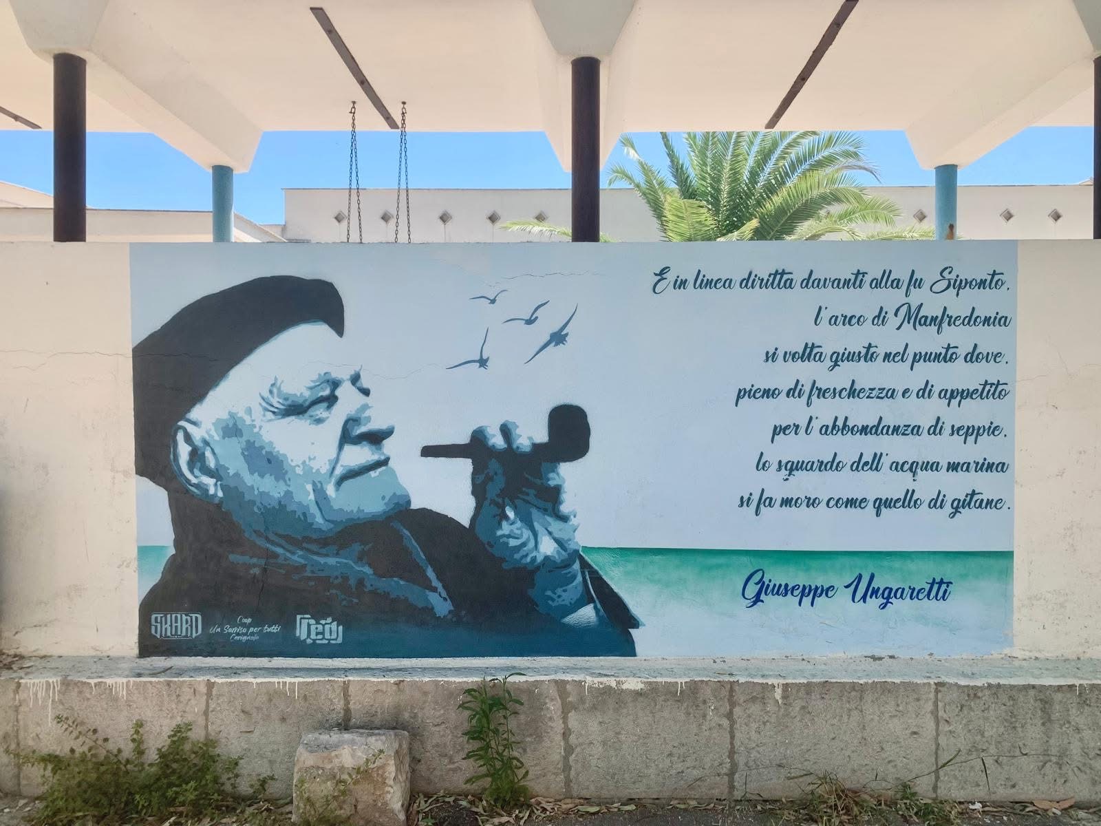 Sulla parete esterna della Casa dei Diritti a Siponto è stato realizzato un murale che raffigura Giuseppe Ungaretti, accompagnato da un suo celebre pensiero dedicato a Manfredonia.